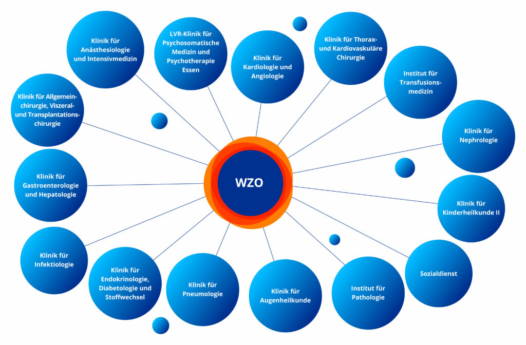 Dass dies gelingt, liegt unter anderem an der Zusammenarbeit vieler hochkarätiger Experten. Diese Interdisziplinarität erfährt durch den Zusammenschluss zum Westdeutschen Zentrum für Organtransplantation (WZO) eine strukturelle Stärkung. Das Zentrum umfasst alle Kliniken und Institute, die an der Versorgung und Behandlung im Rahmen einer Organtransplantation beteiligt sind.